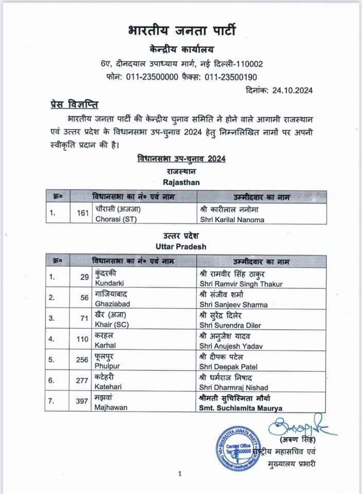 लखनऊ। उत्तर प्रदेश में 13 नवंबर को नौ विधानसभा सीटों पर होने वाले उपचुनाव के लिए भारतीय जनता पार्टी ने अपनी घोषणा कर दी है। वहीं भाजपा ने सात सीटों पर अपने प्रत्याशी उतार दिए हैं। भाजपा ने गाजियाबाद से संजीव शर्मा को, करहल से अनुजेश यादव को, कुंदरकी से रामवीर ठाकुर को, खैर से सुरेंद्र दिलेर को, फूलपुर से दीपक पटेल को, कटेहरी धर्मराज निषाद और मझवां से सुचिस्मिता मौर्या को प्रत्याशी बनाया है।