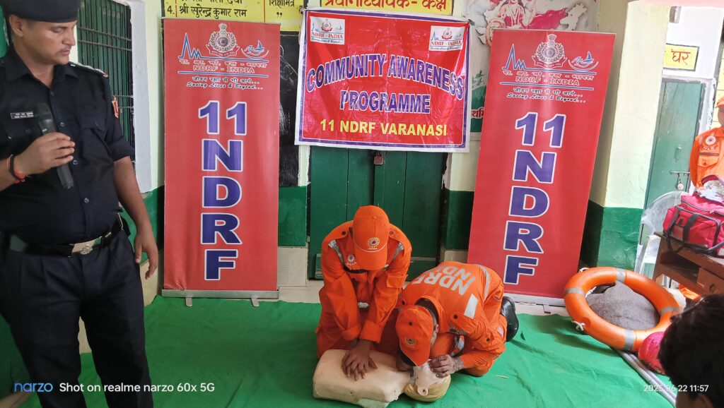 बलिया। जिलाधिकारी के निर्देशानुसार जिला आपदा प्रबंधन प्राधिकरण और 11वीं बटालियन एनडीआरएफ के संयुक्त तत्वावधान में आयोजित आपदा प्रबंधन प्रशिक्षण कार्यक्रम क्षेत्र के जनाडी स्थित प्राथमिक विद्यालय (चकिया के बारी) में ग्रामीणों को बाढ़, आग और भूकंप जैसी आपदाओं से बचाव के तरीकों के बारे में विस्तार से जानकारी दी गई। इस दौरान एनडीआरएफ के निरीक्षक राम यज्ञ शुक्ला ने अपनी टीम के साथ स्टेचर बनाने और सीपीआर देने का डेमो भी दिया।