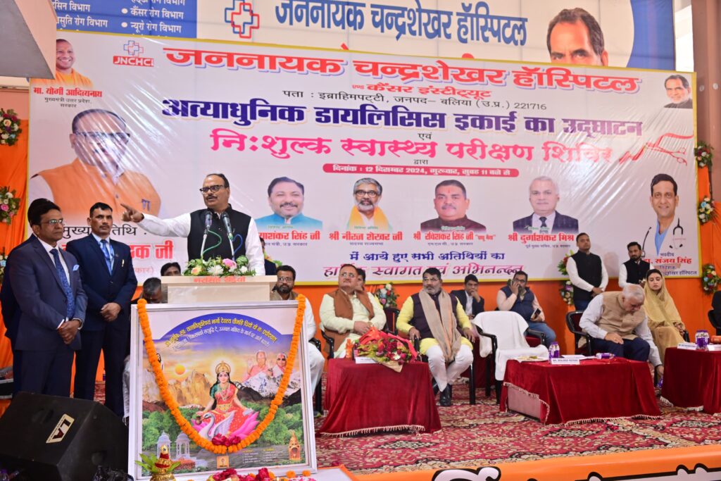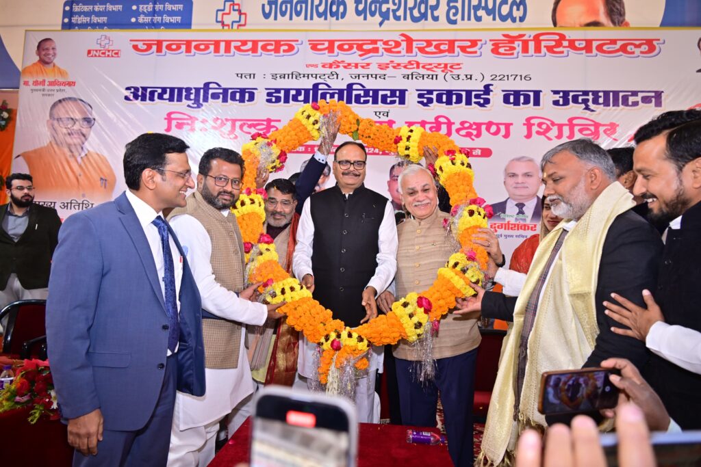 बलिया। प्रदेश के उप मुख्यमंत्री बृजेश पाठक ने गुरूवार को इब्राहिमपट्टी में जननायक चंद्रशेखर हॉस्पिटल एंड कैंसर इंस्टिट्यूट की अत्याधुनिक डायलिसिस इकाई का उद्घाटन किया। उन्होंने निशुल्क स्वास्थ्य परीक्षण शिविर में भी बतौर मुख्य अतिथि प्रतिभाग किया।