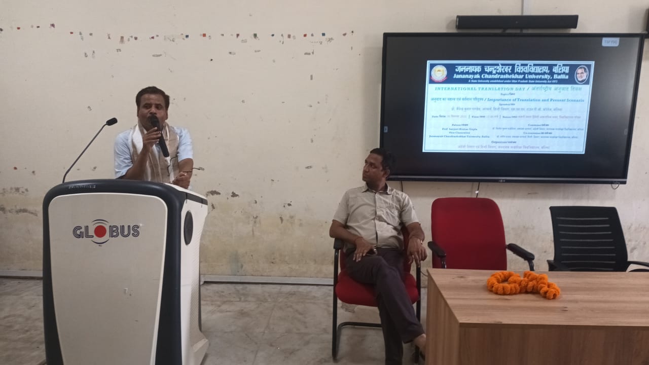 बलिया। जननायक चन्द्रशेखर विश्वविद्यालय के कुलपति प्रो. संजीत कुमार गुप्ता के संरक्षण एवं निर्देशन में सोमवार को ‘अंतरराष्ट्रीय अनुवाद दिवस’ का आयोजन किया गया। इस अवसर पर अंग्रेजी विभाग एवं हिन्दी विभाग के संयुक्त तत्वावधान में ‘अनुवाद का महत्त्व एवं वर्तमान परिदृश्य’ विषय पर संगोष्ठी का आयोजन किया गया।