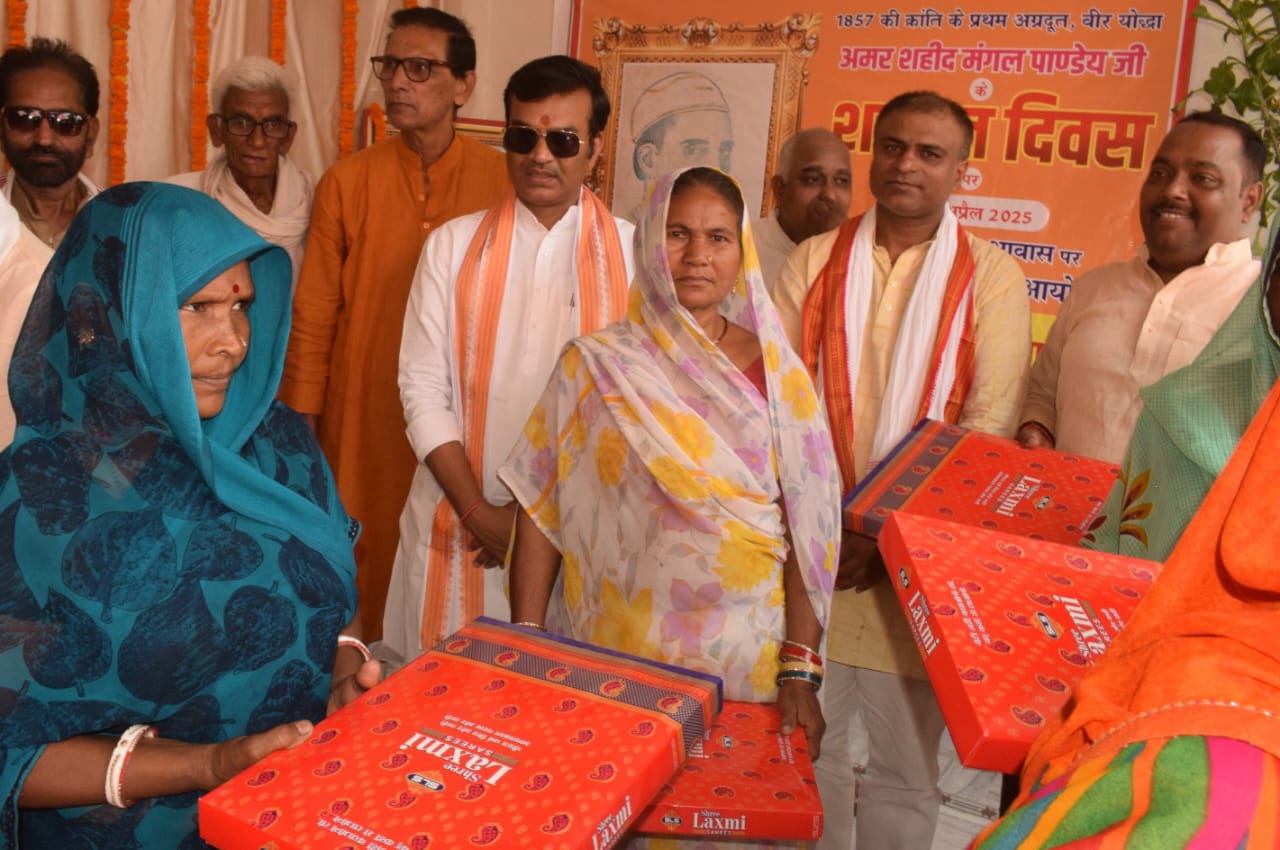 बलिया। आजादी के प्रथम स्वतंत्रता संग्राम सेनानी अमर शहीद मंगल पाण्डेय के बलिदान दिवस पर उनके पैतृक आवास ग्राम नगवां में कार्यक्रम आयोजित किया गया। मुख्य अतिथि पूर्व मंत्री आनंद स्वरूप शुक्ल व विशिष्ट अतिथि कवि व साहित्यकार पूर्व प्रधानाचार्य पंडित विजय मिश्र उपस्थित रहे। अतिथियों द्वारा दीप प्रज्वलित कर कार्यक्रम का शुभारंभ किया गया। इस दौरान असहाय एवं विधवा महिलाओं को आयोजक एवं अमर शहीद के प्रपौत्र संतोष पाण्डेय एवं उनके परिवारी जनों के सहयोग से साड़ी व मिष्ठान वितरित किया गया।