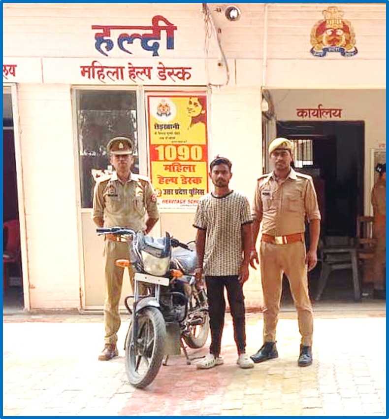 इसी क्रम में हल्दी पुलिस रैपुरा चैन छपरा चौमुहानी पर गश्त कर रही थी। तभी हल्दी जाने वाले मार्ग के पास से एक व्यक्ति मोटर साइकिल से आता दिखाई दिया। पुलिस ने उसे रुकने का इशारा किया तो वह भागने लगा। जिसे पुलिस ने दौड़ा कर पकड़ लिया। पकड़ा गया व्यक्ति से गाड़ी का कागजात मांगा गया तो नहीं दिखाया। पुलिस उसे थाने लेकर आई तो उसने स्वीकार किया कि यह गाड़ी चोरी की है। पकड़े गए अभियुक्त ने अपना नाम गोलू रजक पुत्र महेश रजक निवासी हल्दी बगीचा टोला बताया। बरामदगी के आधार पर गिरफ्तार अभियुक्त के विरुद्ध थानाध्यक्ष द्वारा नियमानुसार आवश्यक कार्यवाही करते हुए न्यायालय भेज दिया गया।