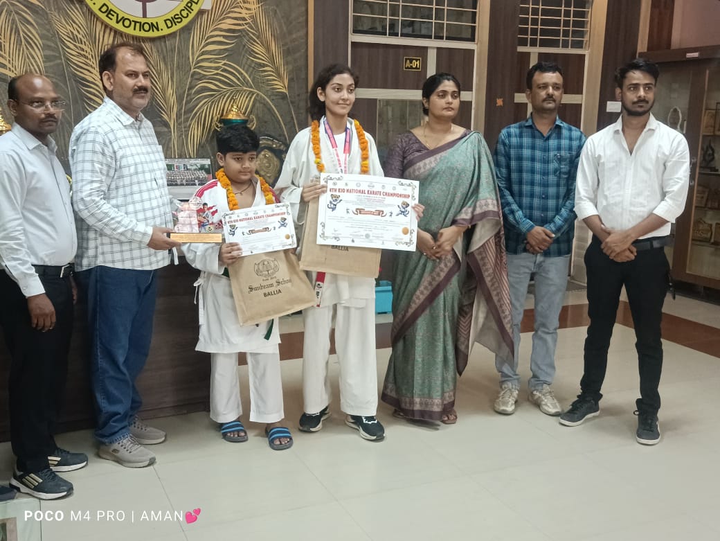 इन दोनों खिलाड़ियों को बलिया शोतोकान कराटे एसोसिएशन के अध्यक्ष डॉ. कुंवर अरुण सिंह गामा और सनबीम स्कूल की प्रधानाचार्या डॉ. अर्पिता गुप्ता ने संयुक्त रूप से अपने विद्यालय में सम्मानित किया। एसोसिएशन के महासचिव सिहान एलबी रावत ने राष्ट्रीय कराटे प्रतियोगिता में जज रेफ्री की भूमिका निभाई और उन्हें कराटे इंडिया ऑर्गनाइजेशन के अध्यक्ष हंसी भरत शर्मा ने मोमेंटों देकर सम्मानित किया। कार्यक्रम में पंकज सिंह, कृष्ण मोहन यादव, सुमित पाठक, नीरज कुमार सिंह, पंकज, भगवान गुप्ता आदि उपस्थित रहे।
