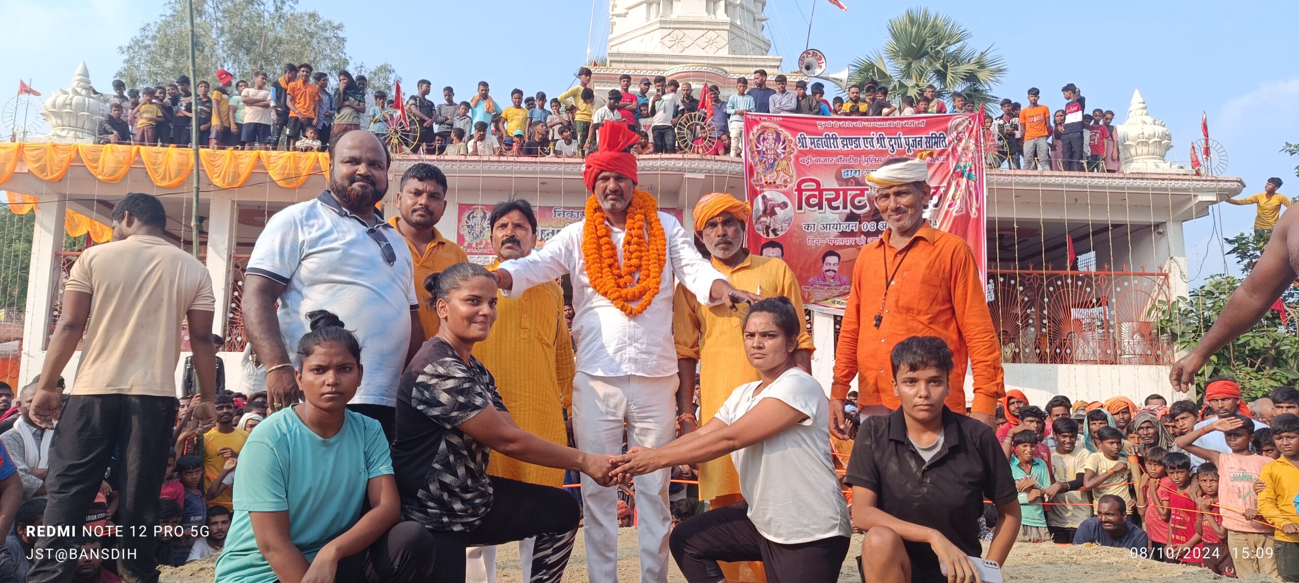 बाँसडीह (बलिया)। शारदीय नवरात्र के छठे दिन मंगलवार को बड़ी बाजार में महावीरी झण्डा पूजन एवं दुर्गा पूजा समिति द्वारा आयोजित पम्परागत एक दिवसीय दंगल प्रतियोगिता का उद्घाटन लोकसभा सलेमपुर के वरिष्ठ समाजसेवी योगेश्वर सिंह के प्रतिनिधि छोटे भाई कामेश्वर सिंह ने माँ जगद्धात्री भवानी की पूजा अर्चना करने के बाद दंगल का फीता काटकर किया। समारोह को संबोधित करते हुए कामेश्वर सिंह ने कहा कि कुश्ती हमारे देश की पहचान है, क्षेत्र में दिनों दिन कुश्ती पिछड़ रहा है। कुश्ती का आयोजन पहलवानों को संजीवनी देती है। उन्होंने कहा कि कुश्ती से लोग स्वस्थ रहते है क्षेत्र में ऐसे आयोजन होते रहने चाहिए। कामेश्वर सिंह ने सभी जीते एवं हारे हुए पहलवानों को प्रोत्साहित करते हुए हार जीत को दरकिनार कर सफलता के लिए प्रयासरत रहने को कहा। इस बार कुश्ती का आयोजन विशेष रहा। कई स्थानों से आए पहलवानों ने दर्शको का खूब मनोरंजन किया।