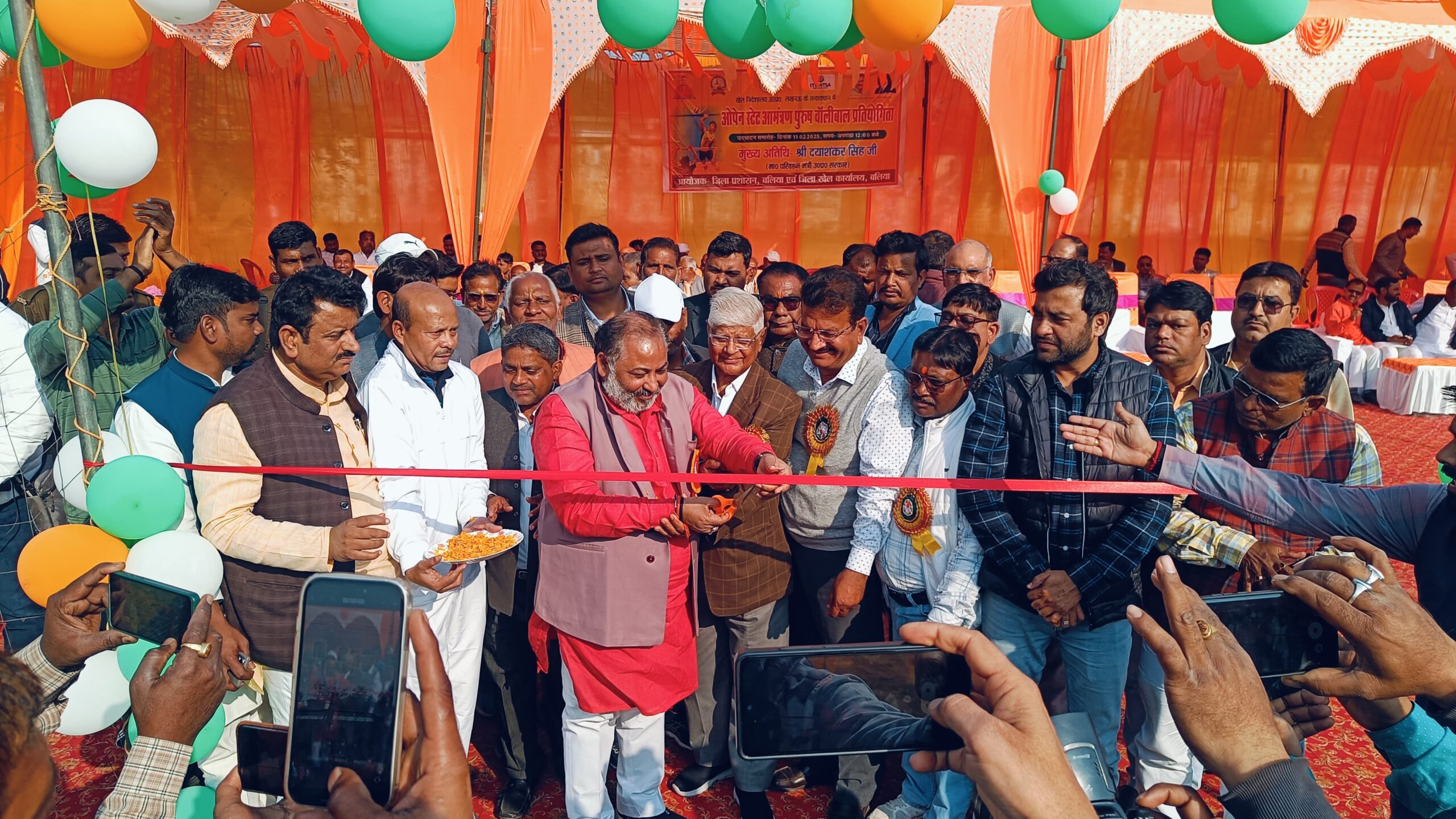बलिया। खेल निदेशालय उ0 प्र0, लखनऊ के तत्वावधान में जिला खेल कार्यालय एवं जिला प्रशासन के समन्वय ओपेन स्टेट आमंत्रण पुरूष वॉलीबाल प्रतियोगिता का आयोजन 11-13 फरवरी 2025 तक जिला खेल कार्यालय वीर लोरिक स्टेडियम, बलिया में किया जा रहा है। उक्त प्रतियोगिता में स्पोर्ट्स हास्टल आयोध्या, स्पोर्ट्स हास्टल प्रयागराज, स्पोर्ट्स हास्टल देवरिया, वाराणसी, गोरखपुर, जौनपुर, सिद्वार्थनगर, गाजीपुर, मऊ एवं बलिया सहित कुल 10 टीमें प्रतिभाग कर रही है, जिसका उद्धाटन 11 फरवरी 2025 को मुख्य अतिथि दयाशंकर सिंह परिवहन मंत्री उ0 प्र0 सरकार के द्वारा फिता काट कर एवं खिलाड़ियों से परिचय प्राप्त कर किया गया।