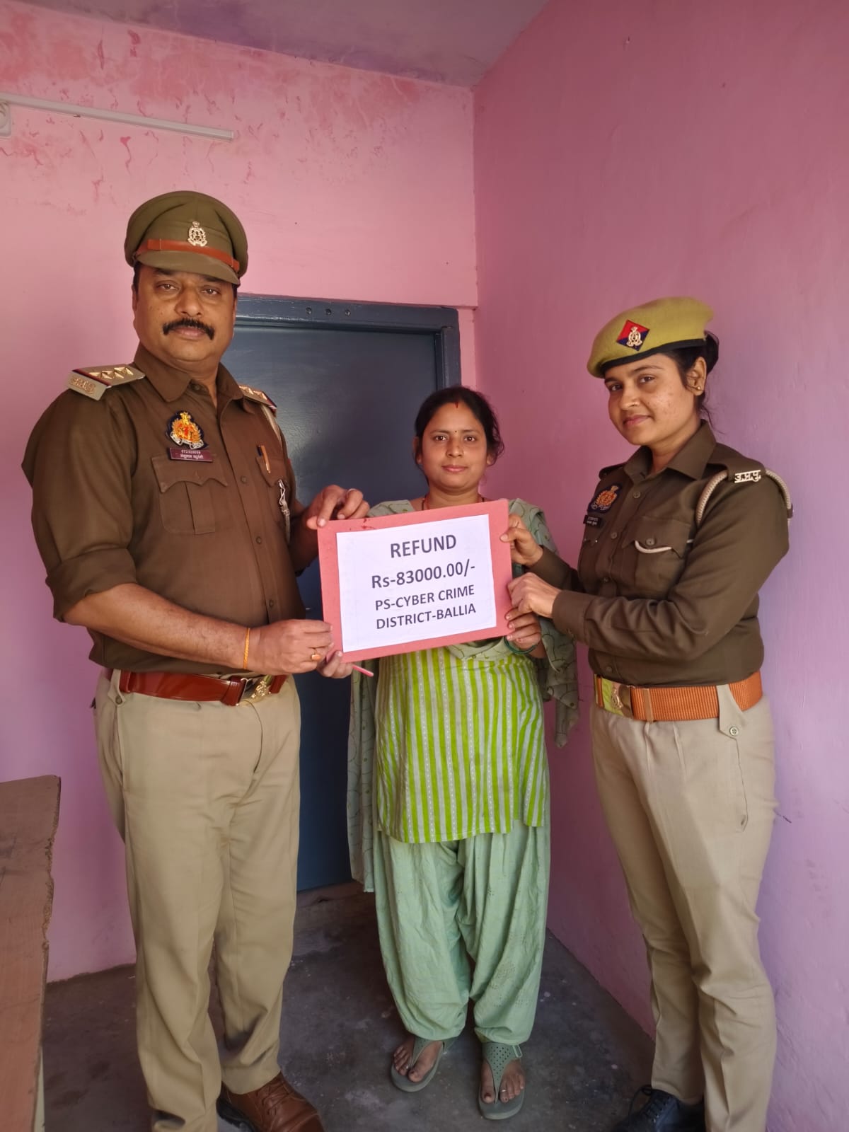पुलिस अधीक्षक व नोडल साइबर सेल बलिया के निर्देशन मे थाना साइबर क्राइम द्वारा तत्काल शिकायत को संज्ञान मे लेते हुए त्वरित विधिक कार्यवाही की गयी, जिसके फलस्वरूप 19 फरवरी को शिकायतकर्ती विनिता सिंह के खाते में धोखाधड़ी की सम्पूर्ण धनराशि कुल 83000 रूपये वापस कराया गया। शिकायतकर्ती विनिता सिंह द्वारा बलिया पुलिस तथा साइबर पुलिस टीम की प्रशंसा करते हुए आभार व्यक्त किया गया।