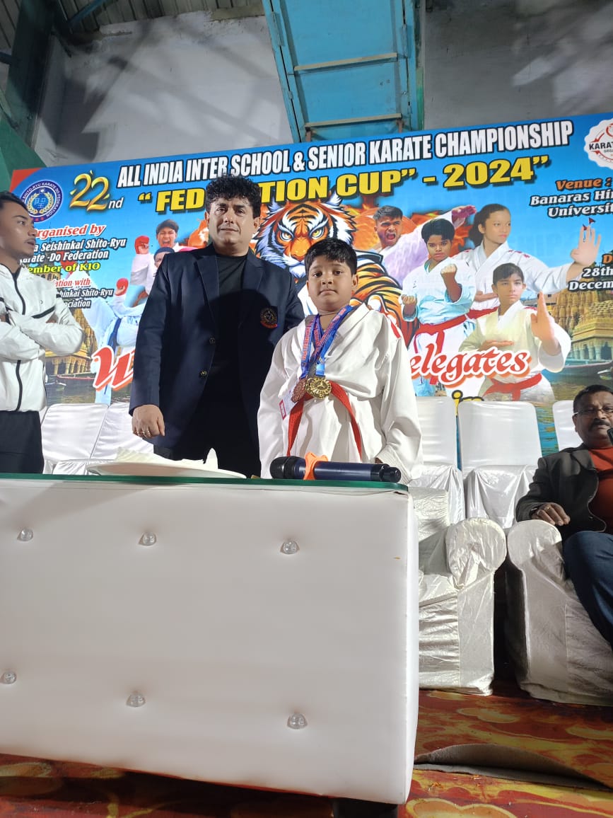 बलिया। ग्लोबल सिंशिकाई सिटोरियों कराटे फेडरेशन ऑफ़ इंडिया के तत्वाधान में 22वाँ ऑल इंडिया इंटर स्कूल एवं सीनियर कराटे चैम्पियनशिप का आयोजन 28, 29 दिसंबर 2024 को बनारस हिंदू विश्वविद्यालय के इनडोर स्टेडियम वाराणसी में संपन्न हुआ। प्रतियोगिता में बलिया शोतोकान कराटे एसोसिएशन के खिलाड़ी आहिल रजा खान अपने 9 वर्ष आयु 50 भार में काता में ब्रॉज कुमिते में गोल्ड जीत कर अपने एसोसिएशन तथा बलिया एवं माता पिता का नाम रौशन किया हैं।