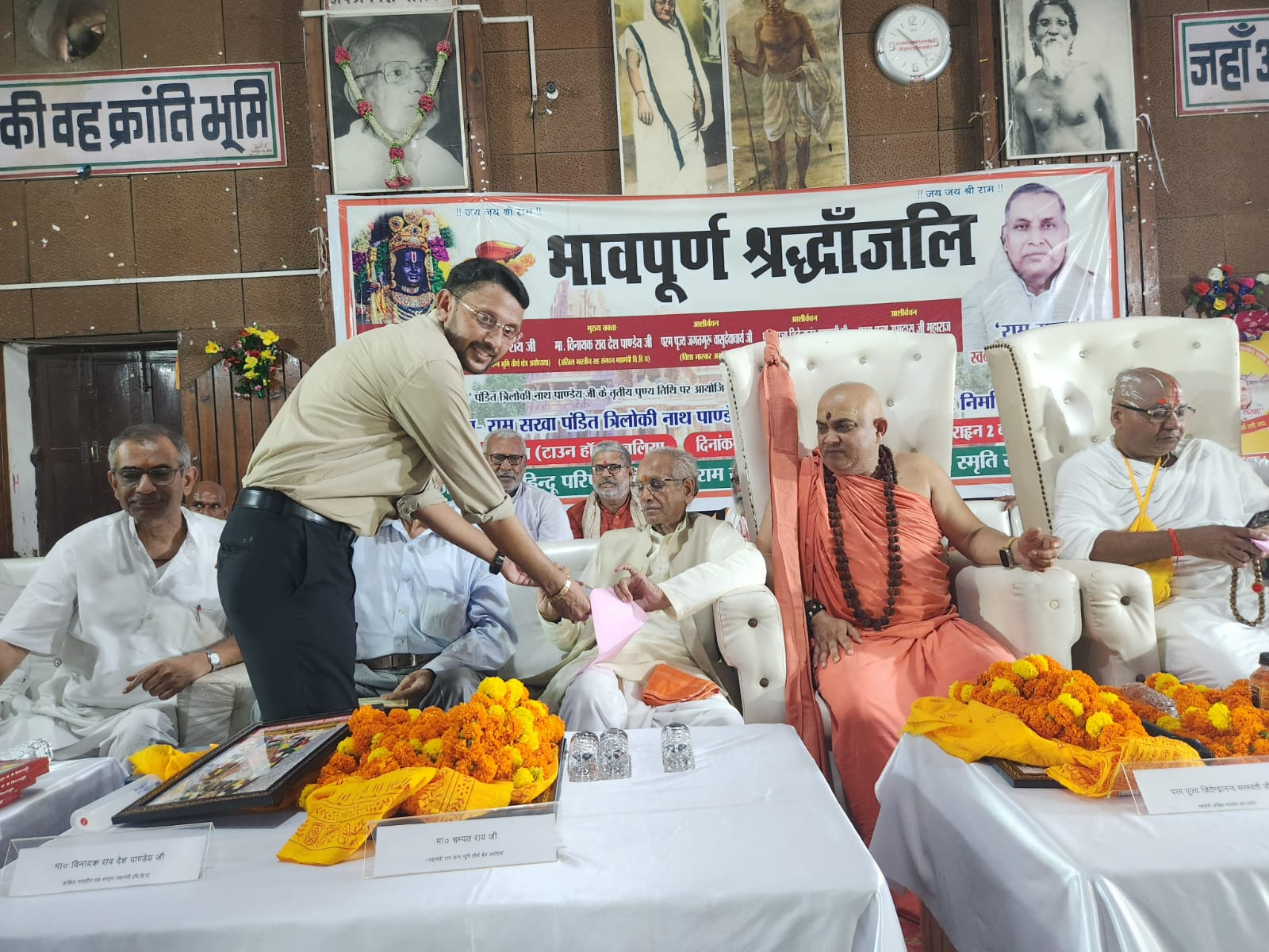 विश्व हिन्दू परिषद के तत्वावधान में नगर के टाउन हाल बापू भवन में श्रीराम जन्मभूमि मामले के पक्षकार राम सखा स्व. त्रिलोकीनाथ पाण्डेय की तृतीय पुण्यतिथि पर सर्वदलीय श्रद्धांजलि सभा हुई। इस दौरान मुख्य अतिथि चंपत राय महासचिव श्रीराम जन्मभूमि तीर्थ क्षेत्र अयोध्या सहित अन्य अतिथियों ने श्रद्धा सुमन अर्पित किया। चंपत राय ने कहा कि भगवान राम शिशु थे। उच्च न्यायालय और सर्वोच्च न्यायालय में राम सखा के रूप में त्रिलोकीनाथ पाण्डेय ने प्रभु श्रीराम का पक्ष रखा था। स्व. पाण्डेय ने 38 वर्ष तक इसकी लड़ाई लड़ी। स्व. त्रिलोकीनाथ पाण्डेय शिलान्यास कार्यक्रम में पांच अगस्त 2020 को शामिल हुए थे। मुख्य वक्ता विनायक राव देश पाण्डेय ने स्व. त्रिलोकीनाथ पाण्डेय के श्रीराम जन्मभूमि आंदोलन में किये गये कार्यों पर चर्चा की। जितेन्द्रानंद सरस्वती ने कहा कि स्व. त्रिलोकीनाथ पाण्डेय ने राम जन्मभूमि के लिए जीवन पर्यंत संघर्ष किया। कार्यक्रम की अध्यक्षता कर रहे श्रीराम तिवारी पूर्व पुलिस महानिदेशक आंध्र प्रदेश ने पाण्डेय के नाम पर बने ट्रस्ट राम सखा पं. त्रिलोकीनाथ पाण्डेय स्मृति सेवा न्यास के तत्वावधान में जन उपयोगी कार्य कराने का आश्वासन दिया। ट्रस्ट का लोकार्पण मुख्य अतिथि चंपत राय ने किया। इस अवसर पर पूर्व सांसद वीरेन्द्र सिंह मस्त, भरत सिंह, पूर्व मंत्री रामगोविन्द चौधरी, राजधारी सिंह, विनोद शंकर दूबे, पूर्व जिलाध्यक्ष देवेन्द्र यादव, जयप्रकाश साहू, विजय बहादुर सिंह, राजनारायण तिवारी मौजूद रहे।