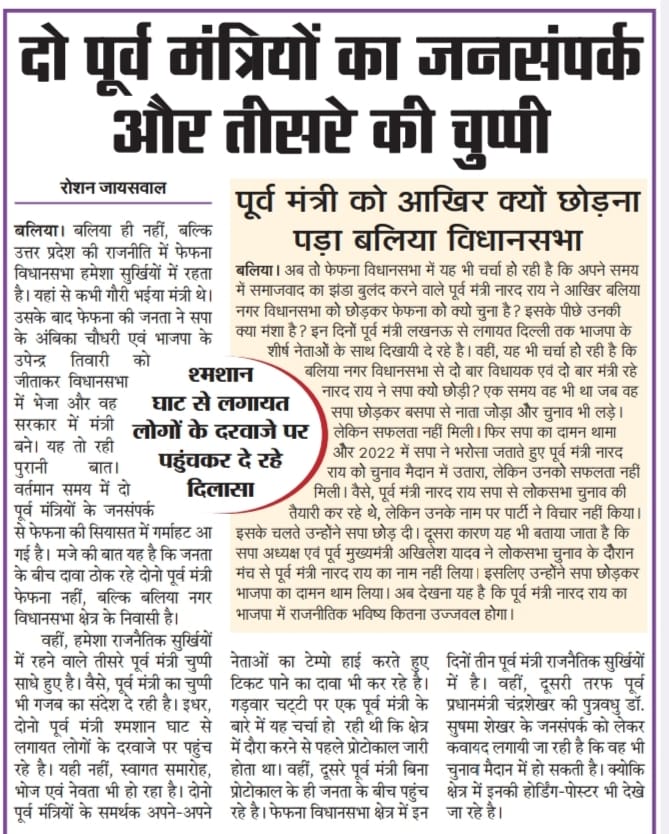 मजे की बात यह है कि जनता के बीच दावा ठोक रहे दोनो पूर्व मंत्री फेफना नहीं, बल्कि बलिया नगर विधानसभा क्षेत्र के निवासी है। वहीं, हमेशा राजनैतिक सुर्खियों में रहने वाले तीसरे पूर्व मंत्री चुप्पी साधे हुए है। वैसे, पूर्व मंत्री का चुप्पी भी गजब का संदेश दे रही है। इधर, दोनो पूर्व मंत्री श्मशान घाट से लगायत लोगों के दरवाजे पर पहुंच रहे है। यही नहीं, स्वागत समारोह, भोज एवं नेवता भी हो रहा है।
