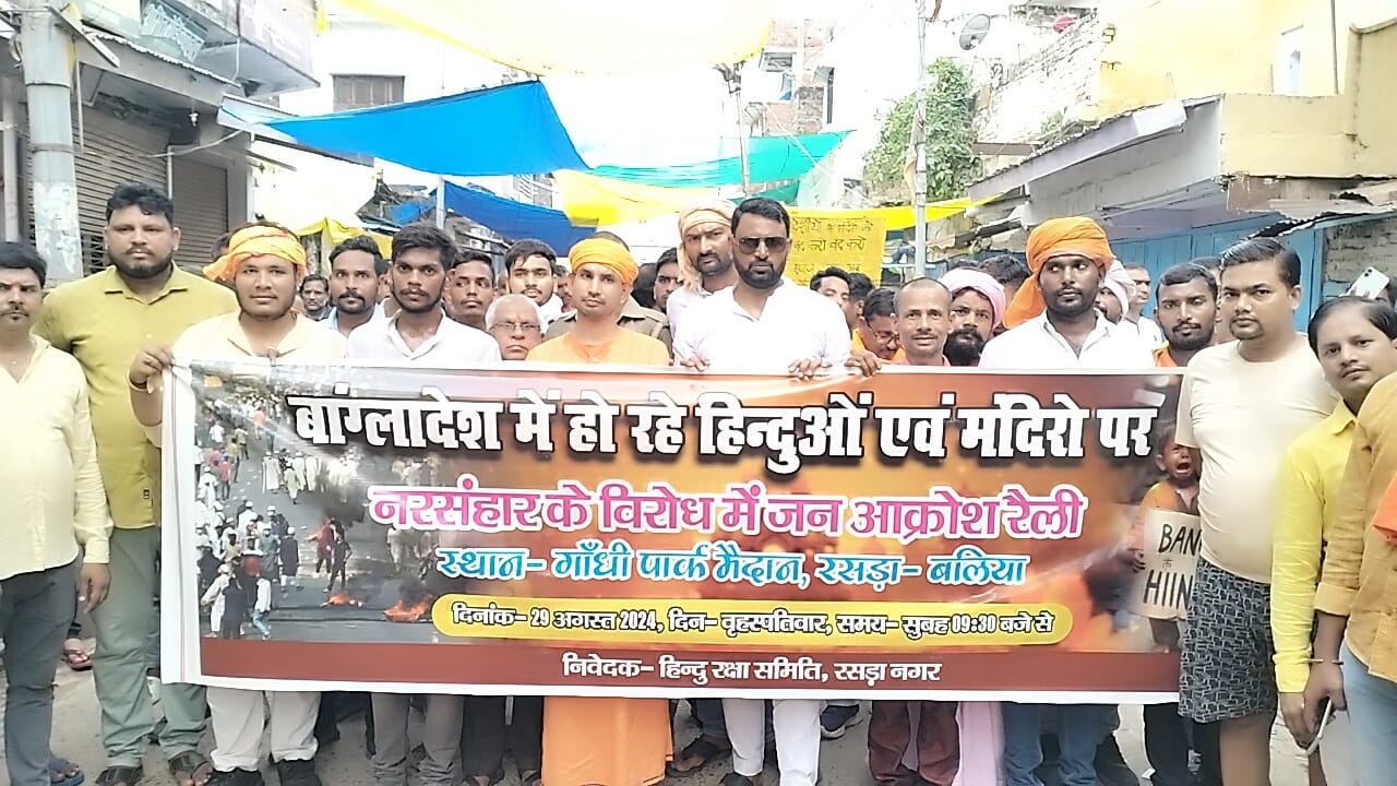 रसड़ा (बलिया)। भारतीय जनता पार्टी, विश्व हिंदू परिषद एवं बजरंग दल के संयुक्त तत्वावधान में गुरुवार को एक विशाल जुलूस स्थानीय गांधी पार्क से निकाला गया, जो श्रीनाथ चौराहा, पूरब मोहल्ला, ब्रह्मस्थान, भगत सिंह चौराहा, स्टेशन रोड होते हुए श्रीनाथ मठ पर आकर समाप्त हो गया। इस जुलूस का नेतृत्व श्रीनाथ बाबा मठ के मठाधीश कौशलेंद्र गिरि, विश्व हिंदू परिषद के नगर अध्यक्ष संतोष आर्य, कौशल गुप्ता, ठाकुर मंगल सिंह, प्रवीण सिंह, संदीप सोनी, अविनाश सोनी कर रहे थे। इस जुलूस में काफी संख्या में नौजवान एवं छात्राएं शामिल रही। जुलूस में भारत माता की जय, बंदे मातरम एवं हिंदू हिंदू एक रहेंगे, भेदभाव को नहीं सहेंगे, बांग्लादेश में हिंदुओं पर अत्याचार नहीं सहेंगे के नारे लगा रहे थे। अपने संबोधन में वक्ताओं ने कहा कि बांग्लादेश में हिंदुओं पर भीषण अत्याचार किया जा रहा है। उनके मठ और मंदिर तोड़े जा रहे हैं और महिलाओं से बलात्कार किया जा रहा है। उन्होंने भारत सरकार से अपील किया कि बांग्लादेश में हिंदुओं पर हो रहे अत्याचारों को तुरंत रोकने के लिए ठोस कदम उठाए। वक्ताओं ने विपक्षी नेताओं पर आरोप लगाया कि वे हिंदुओं पर हो रहे हमलों पर चुप हैं जो उनकी दोगली मानसिकता को दर्शाता है। वे जहां मुसलमान पर हो रहे अत्याचारों पर तो आवाज उठाते हैं लेकिन हिंदुओं पर होने वाले जुल्म पर एक भी शब्द नहीं बोलते हैं। बैठक में भारी संख्या में पुलिस बल तैनात थी। इस कार्यक्रम में प्रमुख रूप से सर्वश्री ओम जी बरनवाल, अजय पांडे, कन्हैया जयसवाल, डॉ0 प्यारे मोहन वर्मा, श्याम कृष्ण गोयल, अजय ठाकुर, संजय गुप्ता, संजय सिंह, सुरेश जयसवाल, शशिकांत जायसवाल विद्याभूषण जायसवाल, शिवम सोनी, अविनाश सोनी, इंद्रजीत सिंह, हर्ष नारायण सिंह सहित बहुत सारे प्रमुख कार्यकर्ता उपस्थित रहे। कार्यक्रम का सफलता पूर्वक संचालन कौशल किशोर गुप्ता ने किया और जुलूस का कार्यक्रम शांति पूर्वक संपन्न हुआ।