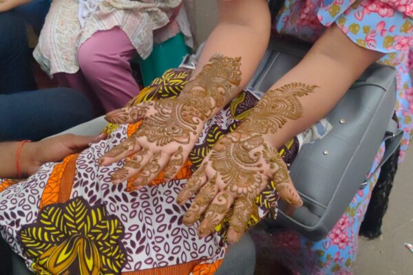 Ballia : हरितालिका तीज व्रत: सुहागिन महिलाओं ने हाथों में लगाई मेहंदी