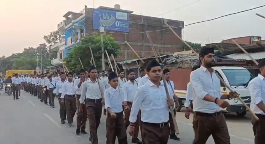 Ballia : संघ शताब्दी वर्ष पर बेरुआरबारी में स्वयंसेवकों का भव्य पथ संचलन, घोष धुनों और नारों से गूंजा वातावरण