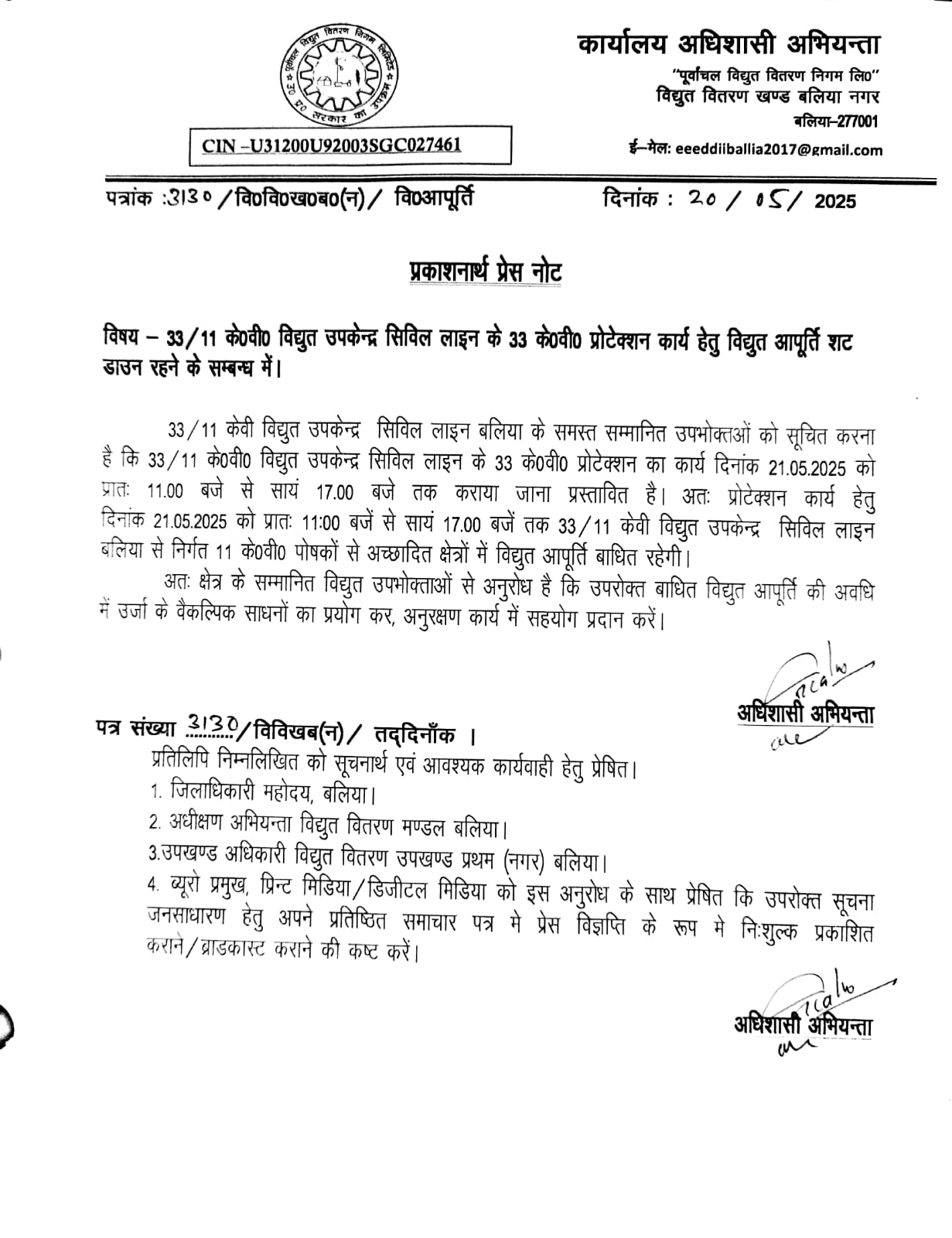 Ballia : जानें किस क्षेत्र में छह घंटे विद्युत आपूर्ति रहेगी बाधित