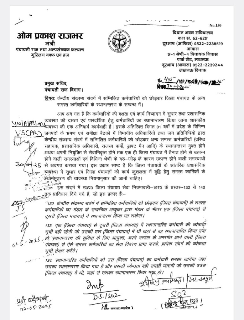 Ballia : जिला पंचायतों में कर्मचारियों के तबादला के लिये मंत्री ने जारी किया पत्र