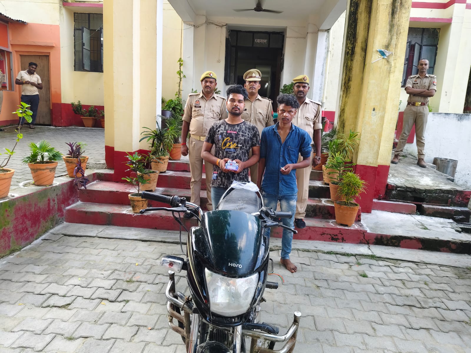 सूचना पाते ही पुलिस टीम दत्तपुर नहर के पास पहुंचकर उक्त दोनों अभियुक्त गोलू उर्फ आदित्य पांडेय पुत्र अवनीश पांडे व राधा राजभर पुत्र मोहन राजभर निवासी कस्बा बांसडीह वार्ड नंबर 10 थाना बांसडीह जनपद बलिया को 11ः15 बजे गिरफ्तार कर लिया। तलाशी लेने पर गोलू उर्फ आदित्य पांडे के पास से 1 रियलमी कंपनी का मोबाइल फोन, 800 रुपए तथा एक चाकू बरामद हुआ। दूसरे अभियुक्त राधा राजभर के पास से 1 चाकू तथा छीनैती की घटना ने प्रयुक्त बाइक बरामद हुई।