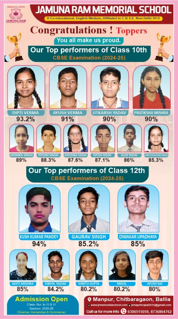 बलिया। सीबीएसई द्वारा आयोजित बोर्ड परीक्षाओं का वार्षिक परीक्षाफल जारी हो चुका है। जमुना राम मेमोरियल स्कूल का रिजल्ट शत प्रतिशत रहा। दीप्ति वर्मा ने हाईस्कूल में सबसे अधिक 92 प्रतिशत अंक प्राप्त कर विद्यालय को गौरवान्वित किया वहीं आयुष वर्मा 91, उत्कर्ष यादव 90, प्रतिक्षा मिश्रा ने 90, अंशिका सिंह 89, पीयूष सिंह 88.3 प्रतिशत, अनुष्का सिंह 87.6, आलोक यादव 86.01, विंध्यवासिनी सिंह ने 85.3 अंक प्राप्त कर विद्यालय परिवार का नाम रोशन किया।