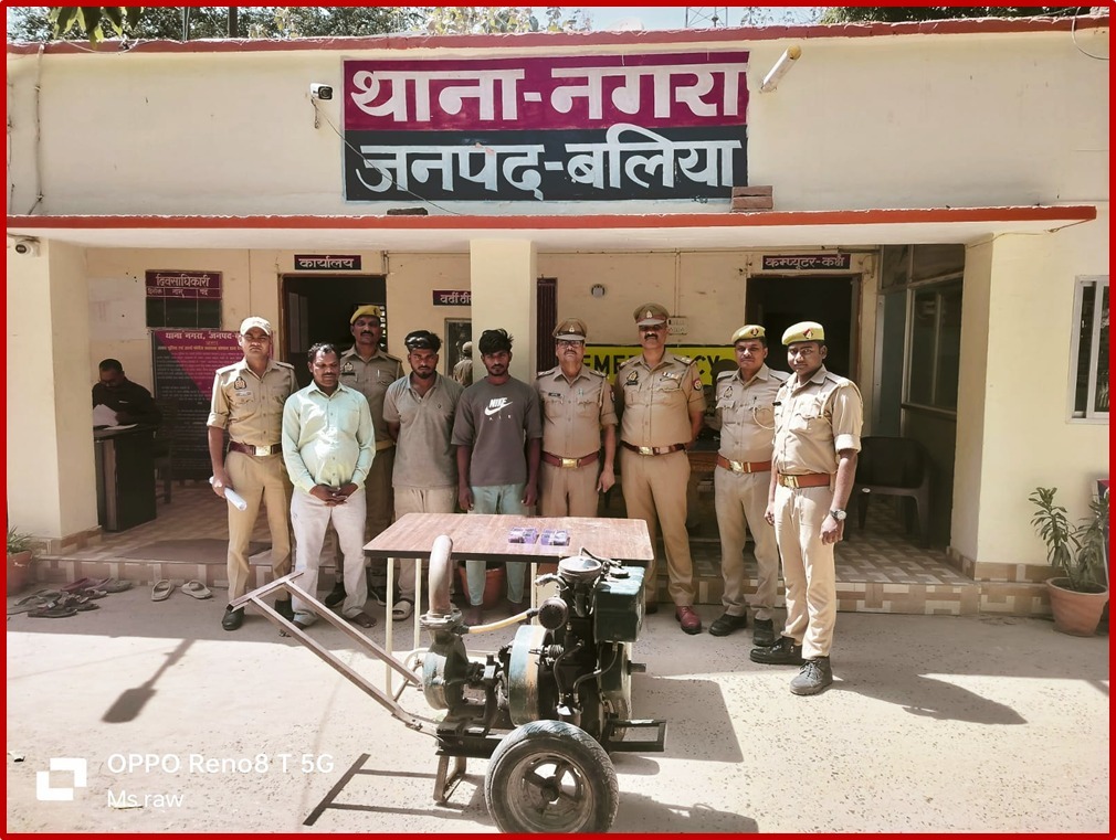 पुलिस ने मुखबिर की सूचना पर अभियुक्तों विवेकानन्द उर्फ विक्की पुत्र वीरेश निवासी कोठिया थाना नगरा, आकाश भारती पुत्र रविशंकर भारती निवासी ग्राम कोठिया थाना नगरा और रामप्रसाद गुप्ता पुत्र स्व. कुबेर गुप्ता वर्ष निवासी ग्राम चचयां थाना नगरा को गिरफ्तार किया है। पूछताछ करने पर अभियुक्तों ने बताया कि बीत तीन अप्रैल को हम लोग अपने साथी विनीत गुप्ता पुत्र संजय गुप्ता निवासी ग्राम इन्दासो थाना नगरा के साथ मिलकर देवेन्द्र कुमार गुप्ता निवासी ग्राम इन्दासो थाना नगरा के खेत में स्थित घर में रखा सिंचाई का पम्प रात्रि मे घर का दरवाजा तोड़कर उठा ले गये तथा सिंचाई के पम्प को ले जाकर कस्बा नगरा चचयां मार्ग पर कबाड़ी के दुकानदार रामप्रसाद गुप्ता पुत्र स्व. कुबेर गुप्ता यहां बेच दिये थे।