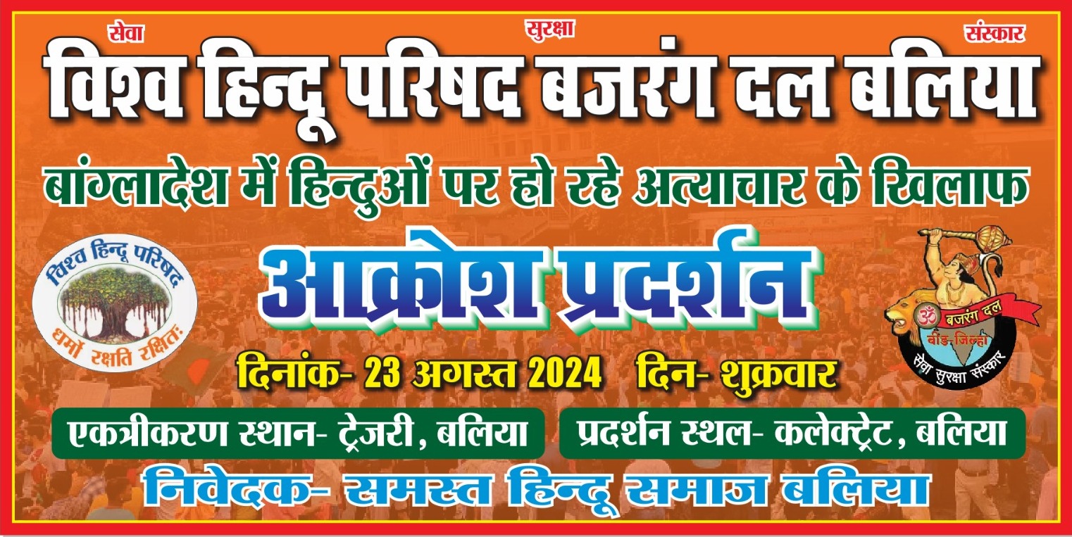 विश्व हिन्दू परिषद के केंद्रीय आव्हान पर प्रांत के प्रत्येक जिला केन्द्रों पर बंगाल में हुए निर्दाेष हिन्दुओं की निर्मम हत्या के विरोध में विशाल आक्रोश प्रदर्शन किया जाएगा। विश्व हिन्दू परिषद-बजरंग दल, बलिया में आयोजित जिला बैठक में प्रांत सह मंत्री मंगलदेव चौबे ने सभी को बांग्लादेश में हो रहे इस्लामिक अत्याचार को बताते हुए सभी को जिहाद के विरुद्ध आव्हान करते हुए कहा कि सनातन संस्कृति संसार की आत्मा है और पूरे विश्व के हिन्दू हमारे अपने हैं। हम ’वसुधैव कुटुम्बकम’ की बात तो करते हैं पर पूरी दुनिया को मानवता सिखाने वाले हिन्दुओं पर लगातर बर्बरता हो रहीं हैं।